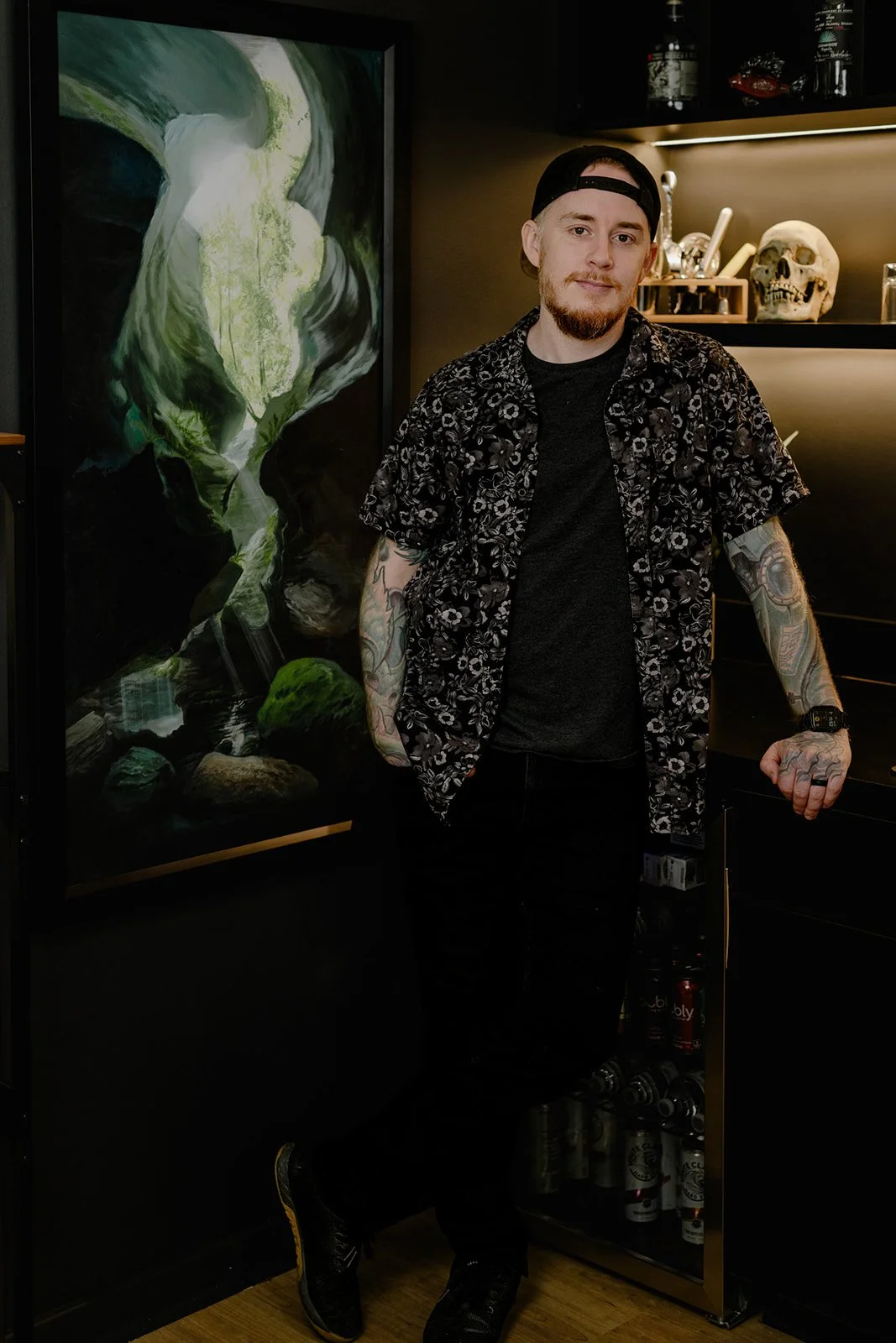 I began my tattoo journey in 2010 but some of my earliest memories encompass a creative sense. I believe crayons were involved. Fast forward to current times and I now co-own a private tattoo studio called Hollow Earth located in Columbus, Ohio. I enjoy conceptualizing new and unique ideas that fall under the dark arts realm. I seek concepts that find a balance between beauty and decay while incorporating a deep sense of mystery and topping it off with a touch of bio organic textures and shapes to transform the body. Some of my favorite subjects to tattoo are creature concepts that you see in sci-fi horror films or monsters you read about in stories from authors like H.P. Lovecraft or Stephen King. I’ll never turn down the classics like a skull or rose but don’t be surprised if I throw in a twist…